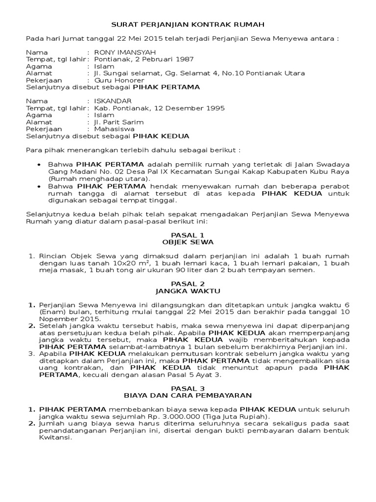 Surat perjanjian sewa rumah adalah dokumen yang mengatur kesepakatan sewa rumah antara penyewa dan pemilik rumah. Contoh surat perjanian kontrak rumah ini dibuat bertujuan supaya prasarana ini dapat menjadi panduan bagi anda untuk. Penyewa juga dinasihatkan untuk menurunkan tandatangan ringkas di setiap helaian muka surat perjanjian bagi menunjukkan mereka telah membaca setiap kandungan yang ada dalam perjanjian itu, katanya. Surat perjanjian sewa rumah ini telah dibuat dengan berdasarkan pada ketentuan. Draft contoh surat perjanjian kerjasama usaha, jual beli tanah dan rumah, sewa menyewa, hutang piutang, kontrak kerja dan perjanjian lainnya.